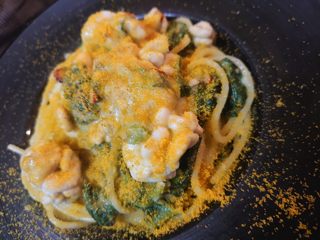『真鱈白子と縮みほうれん草の柚子風味スパゲッティ カラスミがけ』